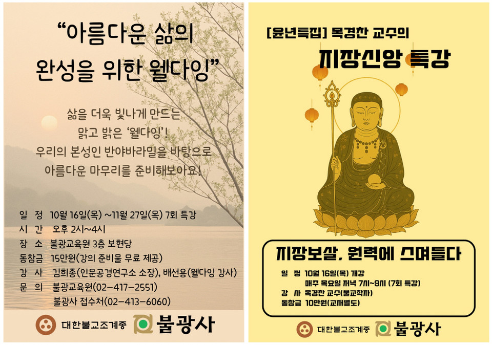 참가비는 웰다잉 강좌 15만 원, 지장신앙 특강 10만 원이며 교재비는 별도다. 신청은 불광교육원(02-417-2551)이나 불광사 접수처(02-413-6060)에서 가능하다. 자세한 일정과 내용은 불광사 홈페이지(www.bulkwangsa.org)에서 확인할 수 있다.